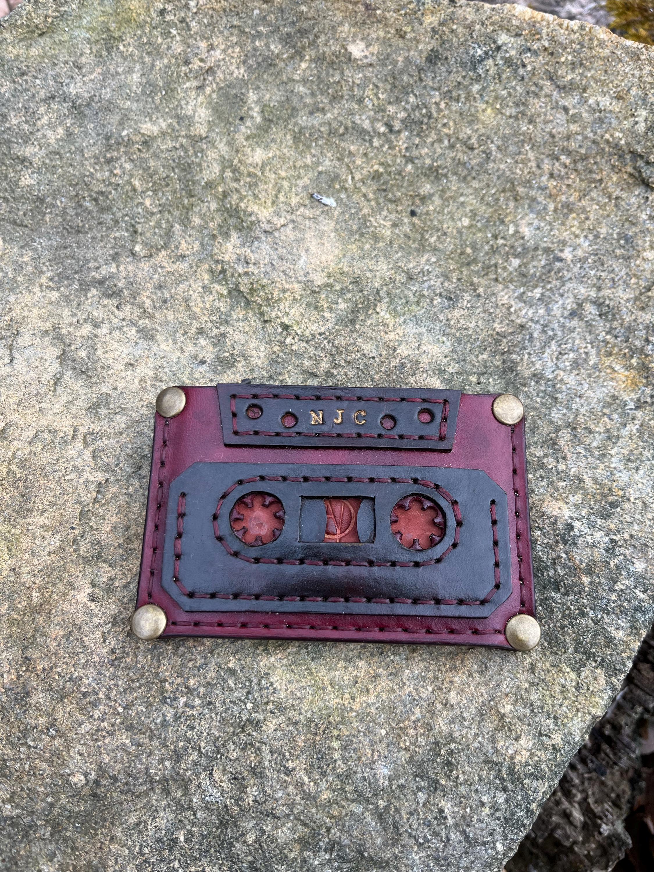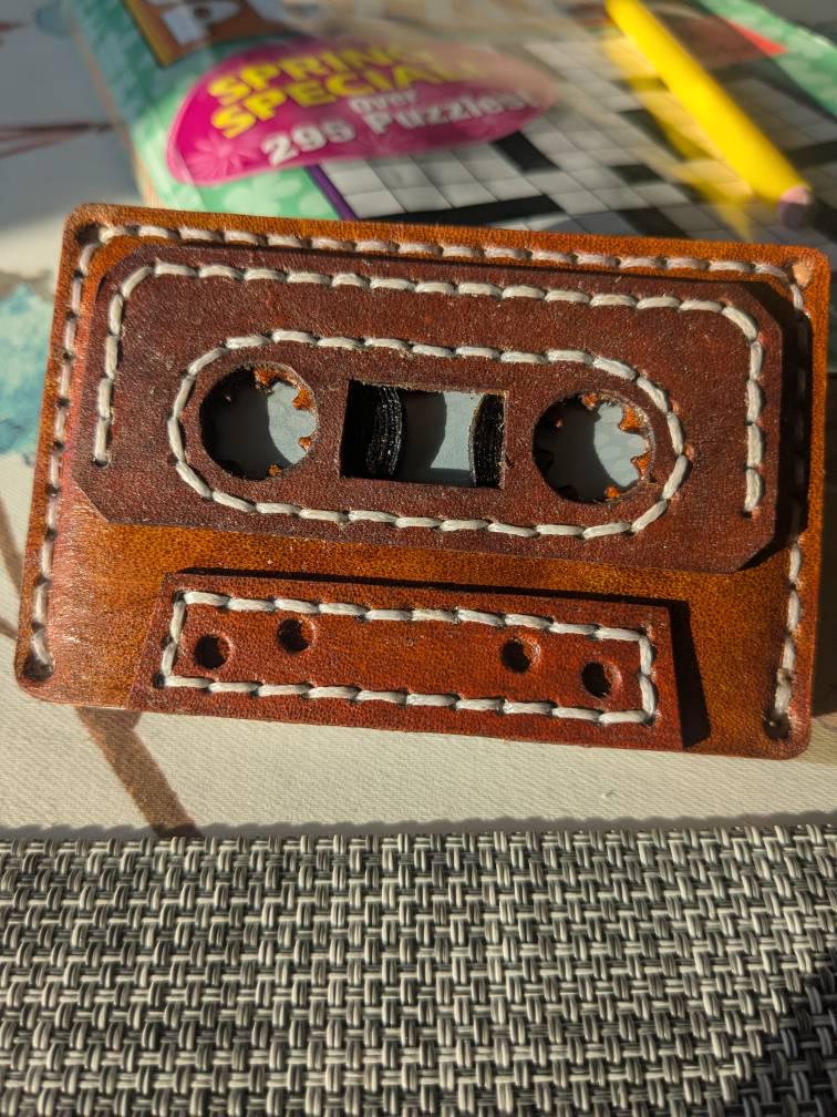 - This is a digital PDF pattern meant to guide you through creating a leather card holder that resembles an audio cassette as shown in the pictures.