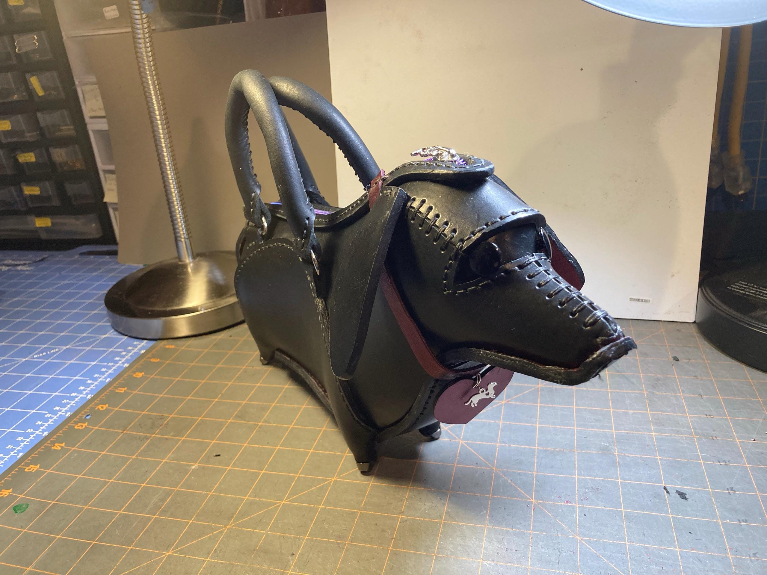 Great pattern. Super cute and a great size. Video made it really easy to know how to put it together. The only issue I had was my own fault because I didn’t follow the directions for the thickness of the leather. I used plain black veg tan that was 2-3x thicker plus I glued on a thin sparkly red leather as a “lining” making it even thicker. Result: some of the holes didn’t line up (just on the longer pieces). I added shank buttons for the eyes and a collar.